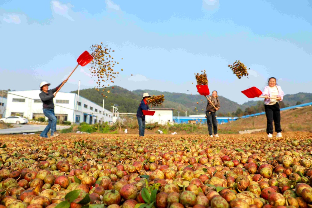 初冬時節,貴州省黔東南苗族侗族自治州從江縣種植的油茶果迎來全面收獲期,村民們搶抓晴好天氣晾曬油茶果,鄉村呈現一派繁忙景象。11月12日,貴州省從江縣丙梅街道居民在晾曬油茶果(無人機照片)。目前,該縣油茶種植面積累計達17.16萬畝,掛果面積8.23萬畝,今年預計產茶籽產量約8200噸,產值約1.2億元。